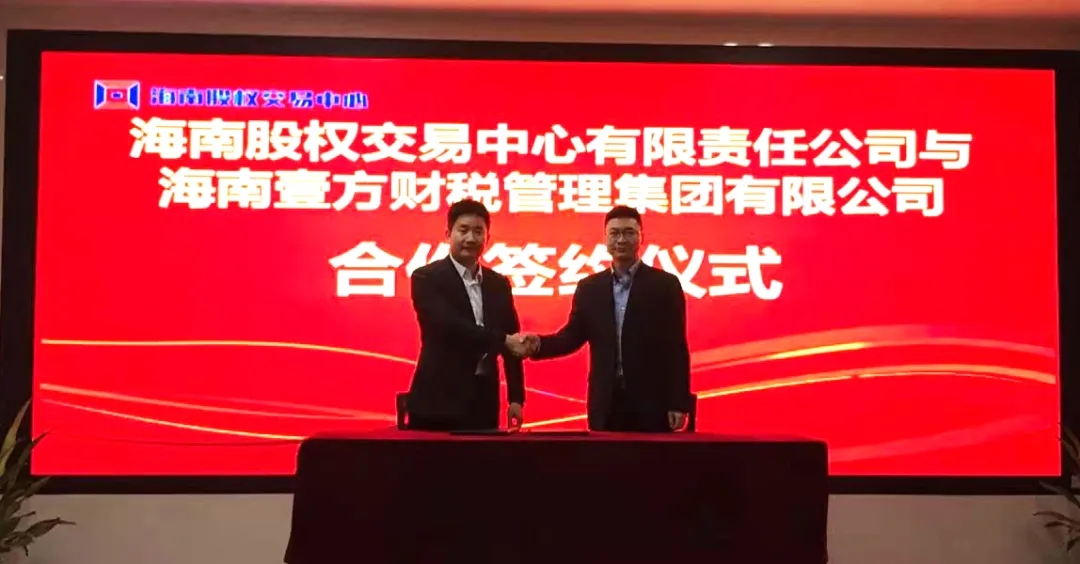 12月14日下午,海南股交與海南壹方財稅管理集團有限公司(以下簡稱“壹方財稅集團”)在澄邁老城軟件園舉行商務(wù)服務(wù)合作簽約儀式。雙方本著平等互利、資源共享、優(yōu)勢互補的原則,建立合作伙伴關(guān)系,拓展雙方業(yè)務(wù)領(lǐng)域,實現(xiàn)互惠共贏。海南股交執(zhí)行總經(jīng)理程棟才、總經(jīng)理助理卜麗麗、壹方財稅集團總裁胡天宇、營銷副總裁陳雷參加了簽約儀式。
